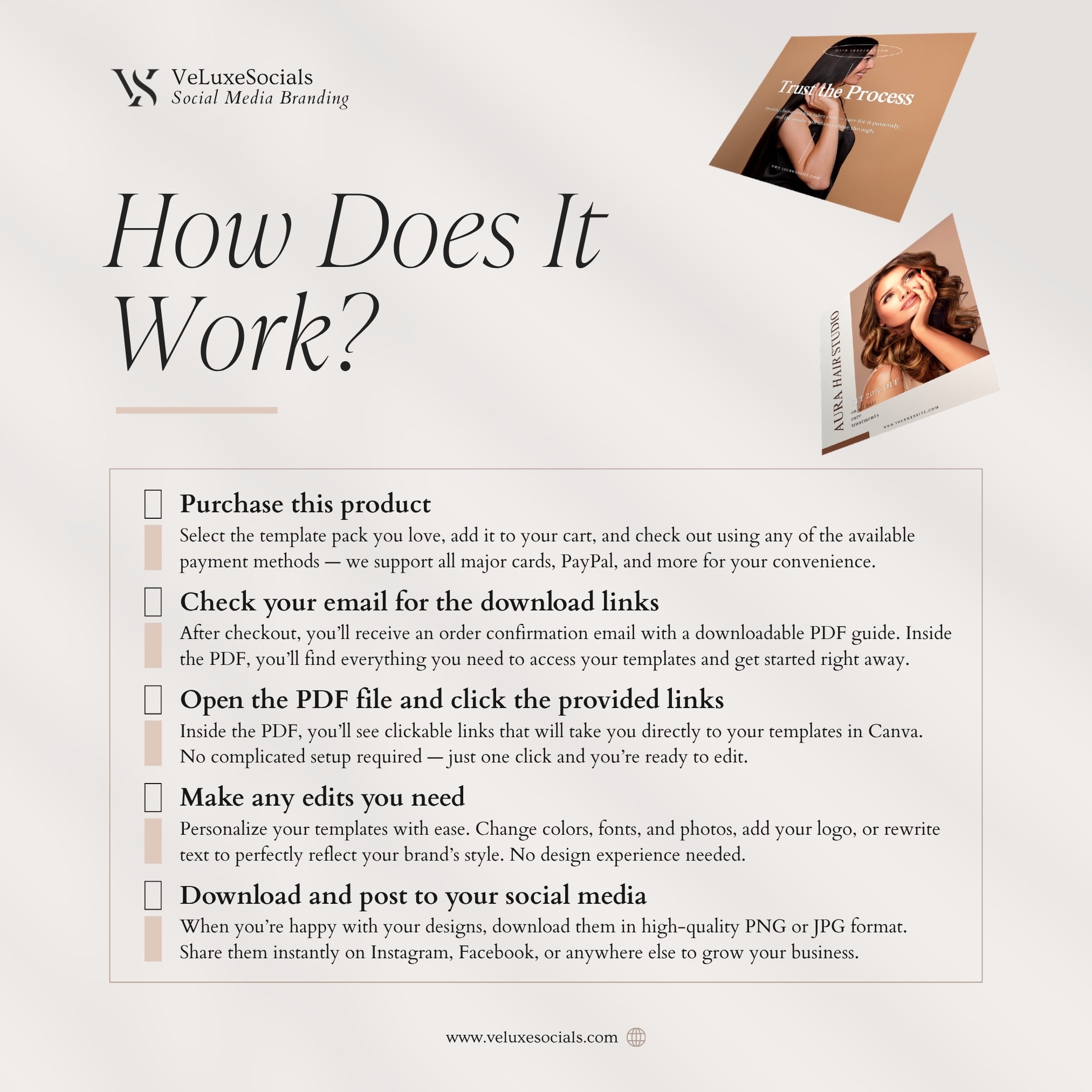 After purchase, you will receive instant access to a downloadable PDF containing the template links. Open the links in Canva, customize the designs by adjusting photos, fonts, colors, and text, then download and publish them on your social media.