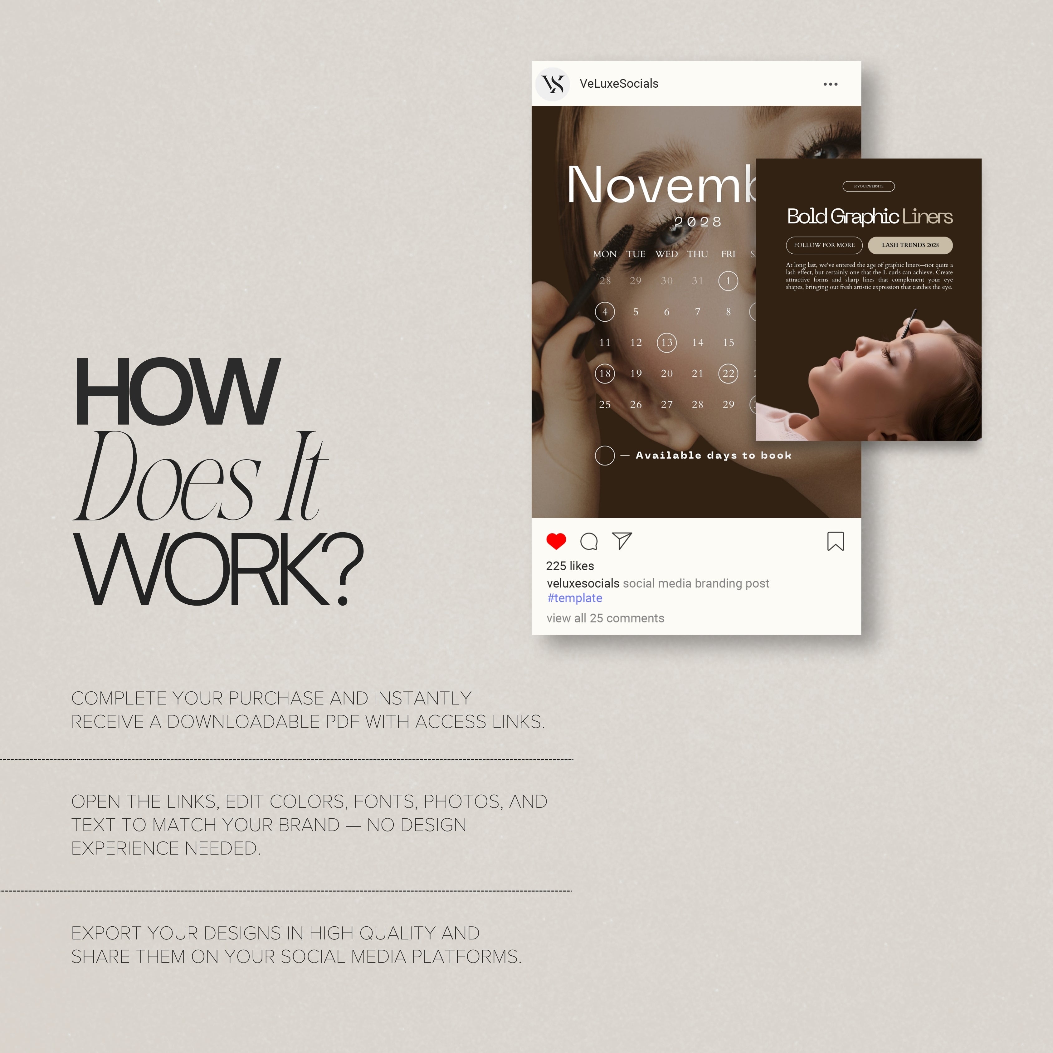 After purchase, you will receive instant access to a downloadable PDF containing the template links. Open the links in Canva, customize the designs by adjusting photos, fonts, colors, and text, then download and publish them on your social media.