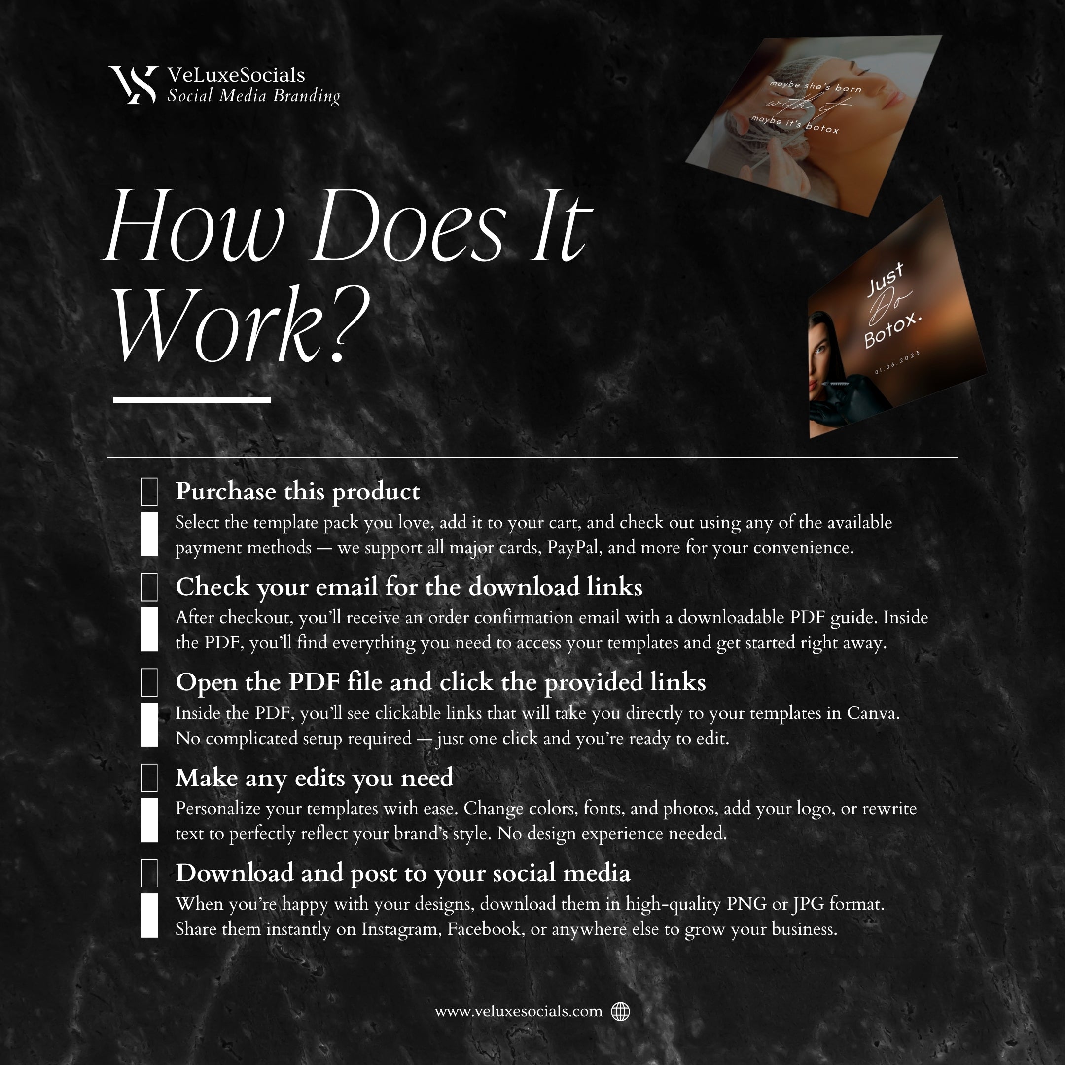 After purchase, you will receive instant access to a downloadable PDF containing the template links. Open the links in Canva, customize the designs by adjusting photos, fonts, colors, and text, then download and publish them on your social media.