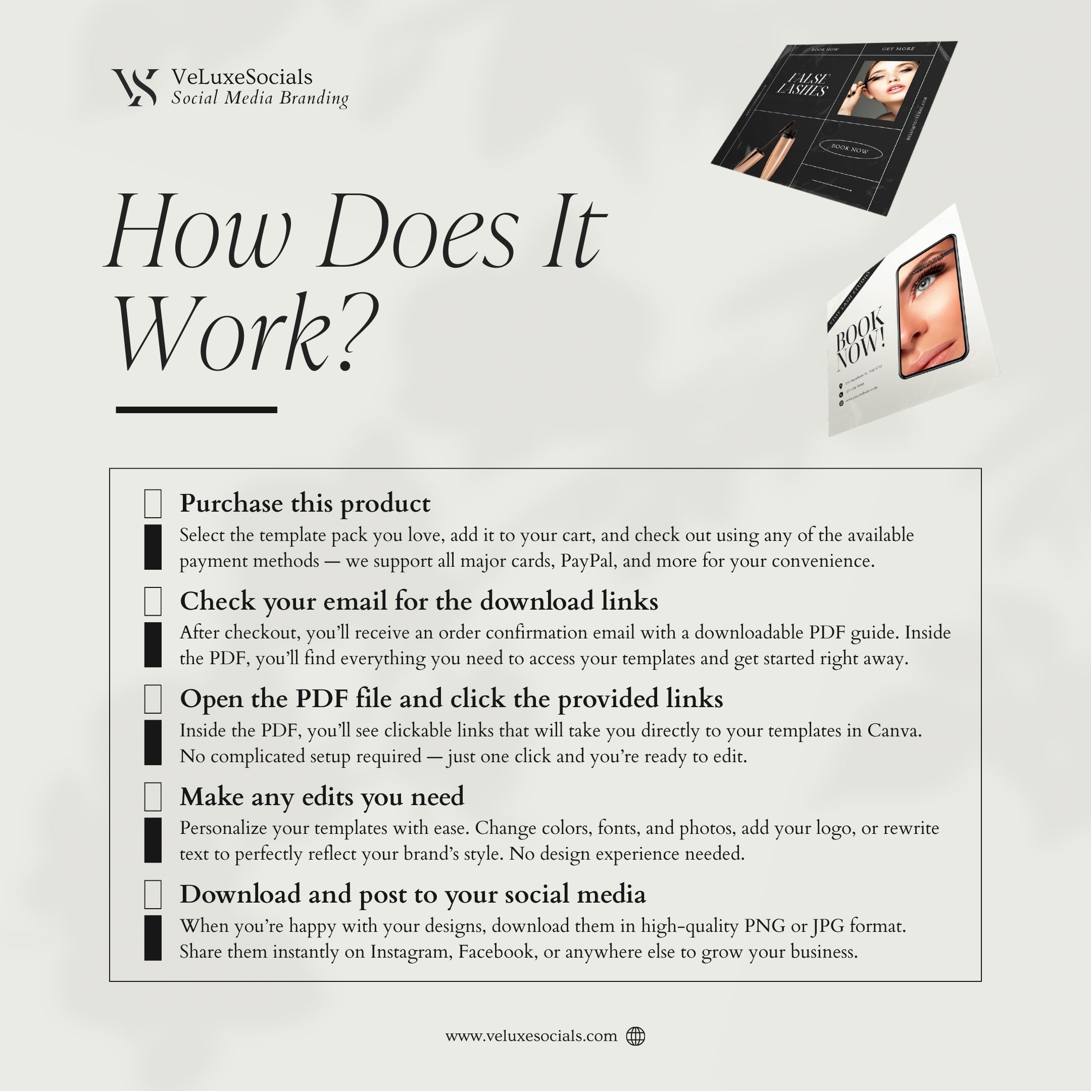 After purchase, you will receive instant access to a downloadable PDF containing the template links. Open the links in Canva, customize the designs by adjusting photos, fonts, colors, and text, then download and publish them on your social media.