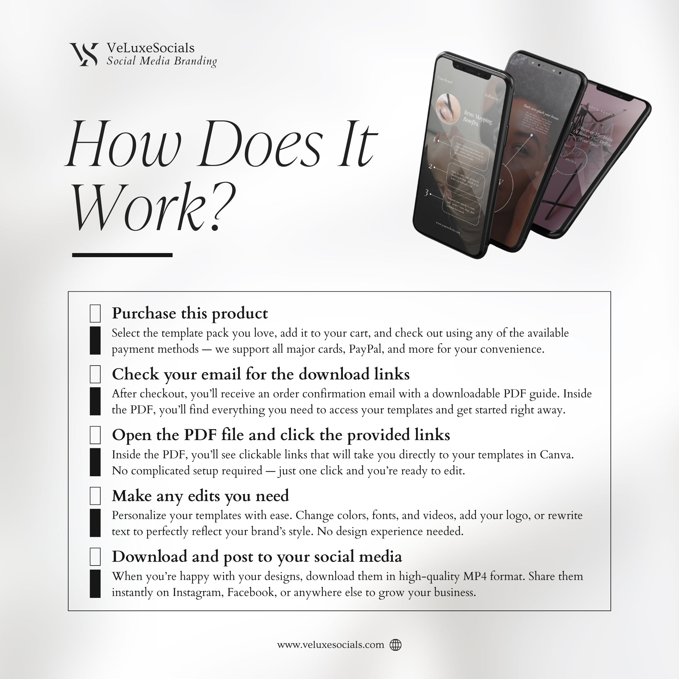After purchase, you will receive instant access to a downloadable PDF containing the template links. Open the links in Canva, customize the designs by adjusting photos, fonts, colors, and text, then download and publish them on your social media.