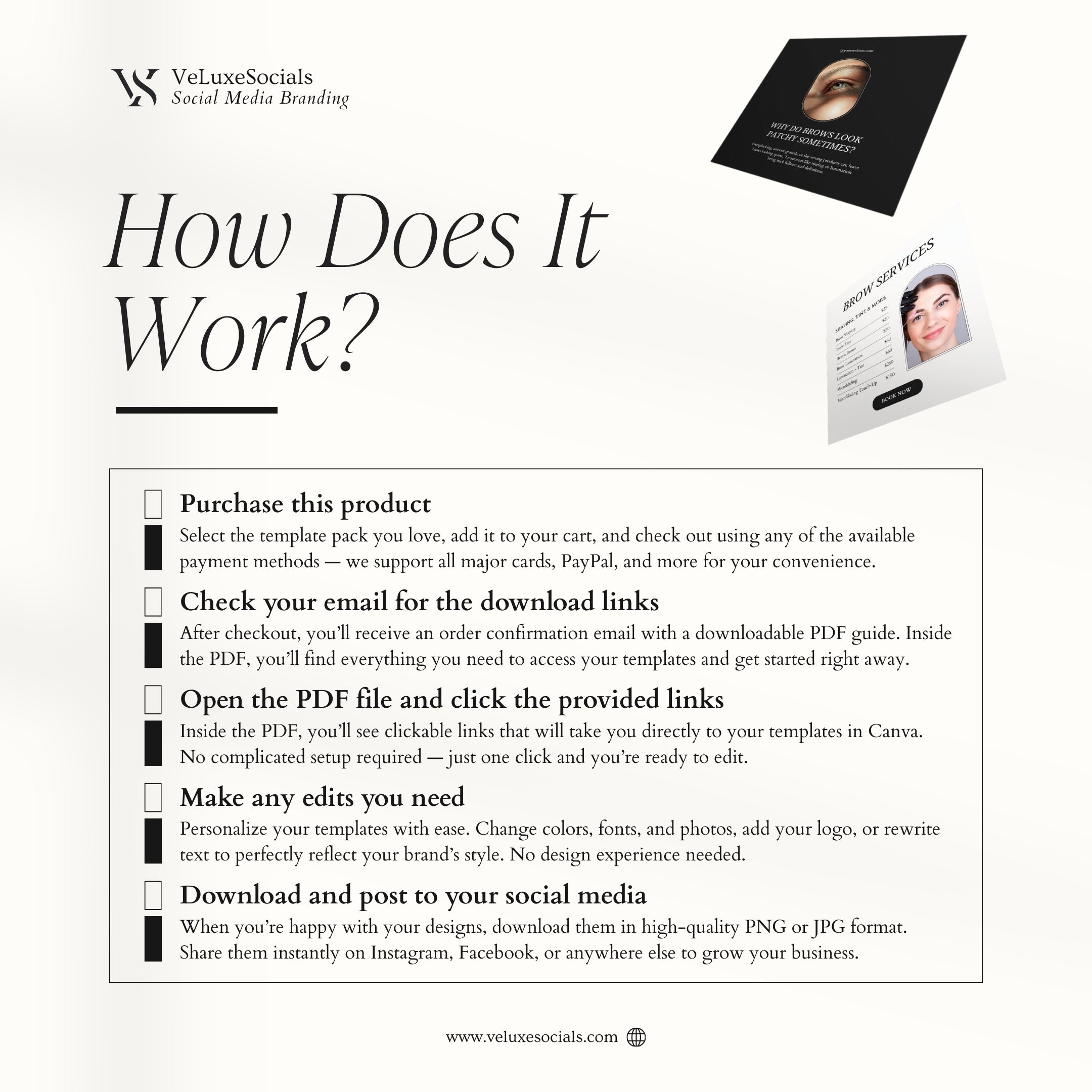After purchase, you will receive instant access to a downloadable PDF containing the template links. Open the links in Canva, customize the designs by adjusting photos, fonts, colors, and text, then download and publish them on your social media.