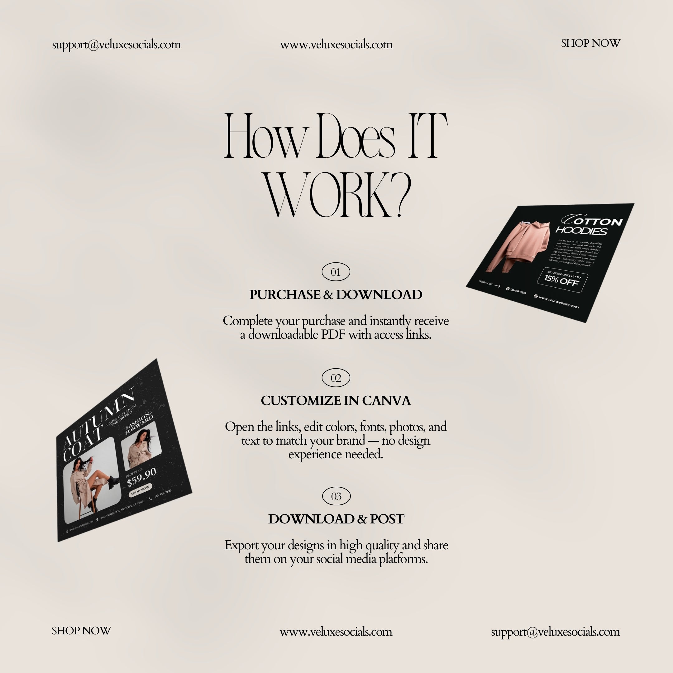 After purchase, you will receive instant access to a downloadable PDF containing the template links. Open the links in Canva, customize the designs by adjusting photos, fonts, colors, and text, then download and publish them on your social media.