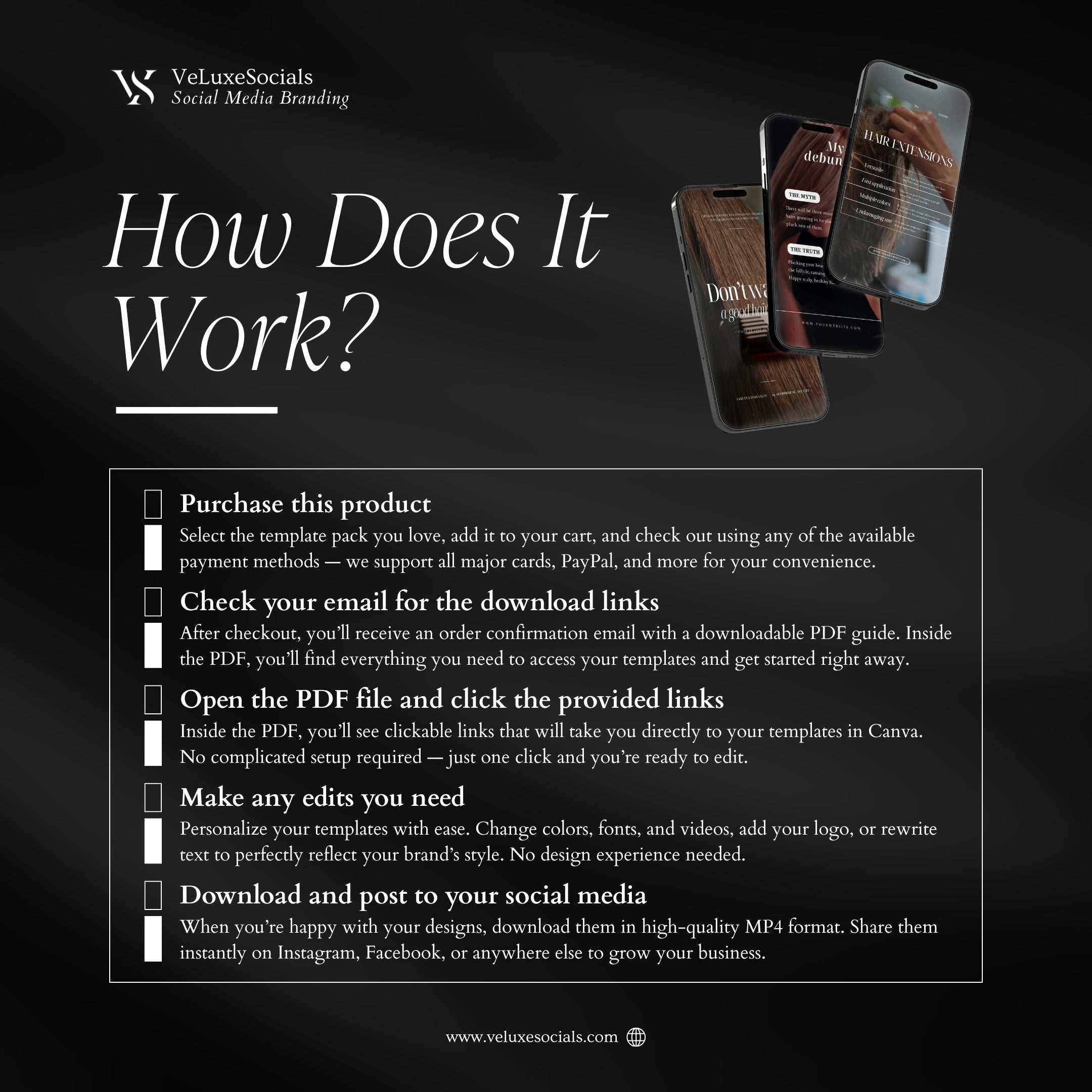After purchase, you will receive instant access to a downloadable PDF containing the template links. Open the links in Canva, customize the designs by adjusting photos, fonts, colors, and text, then download and publish them on your social media.