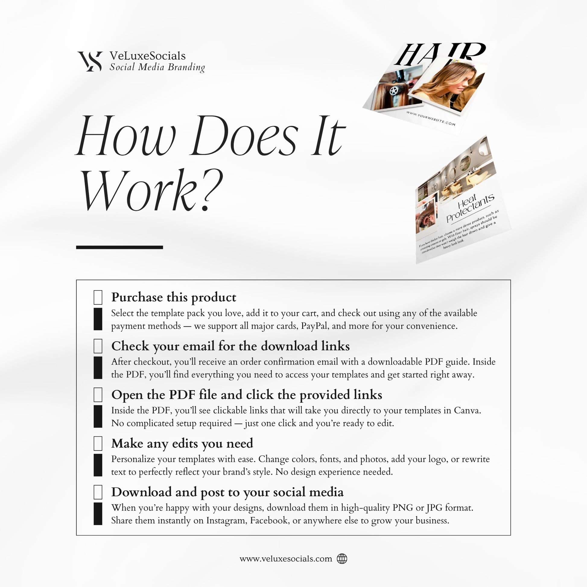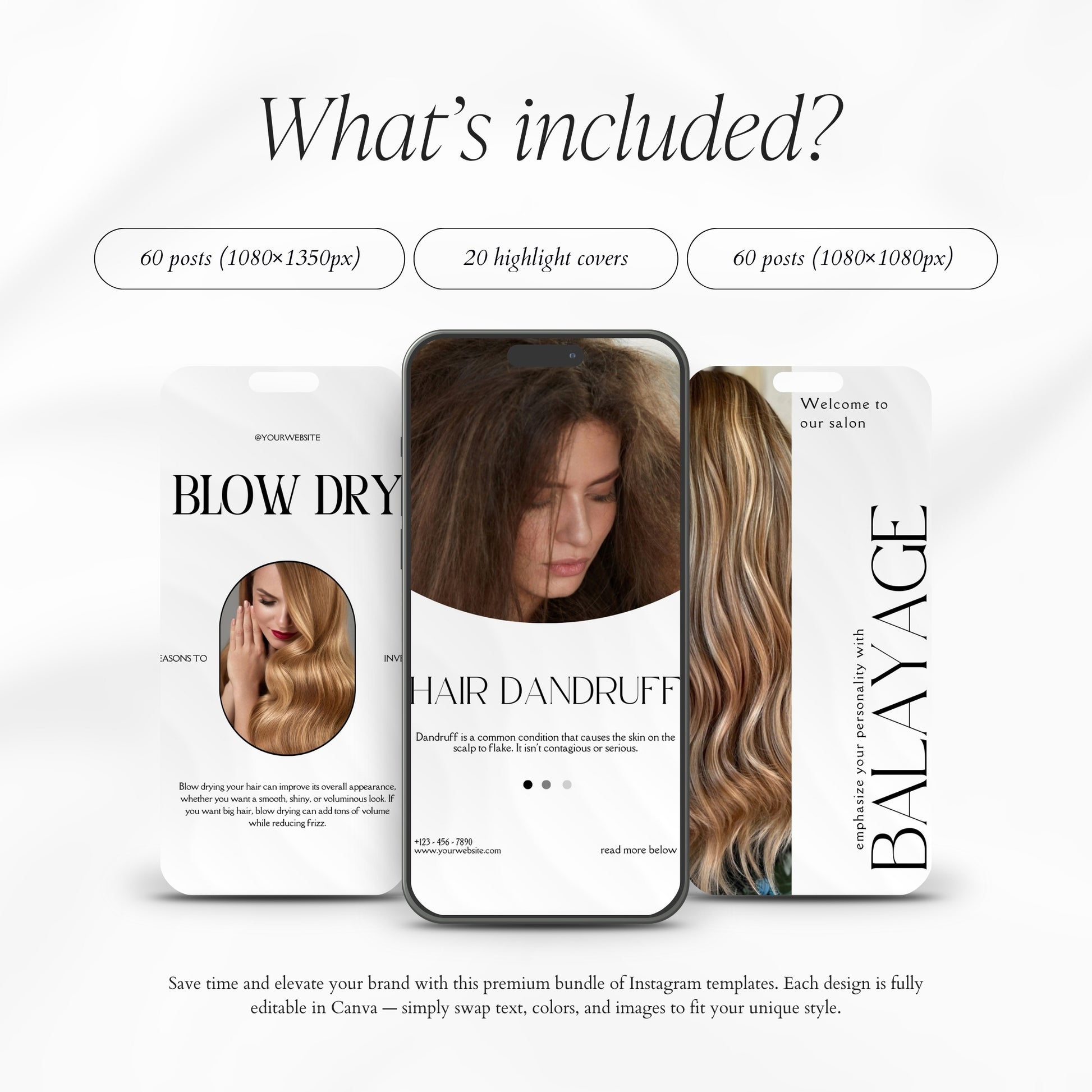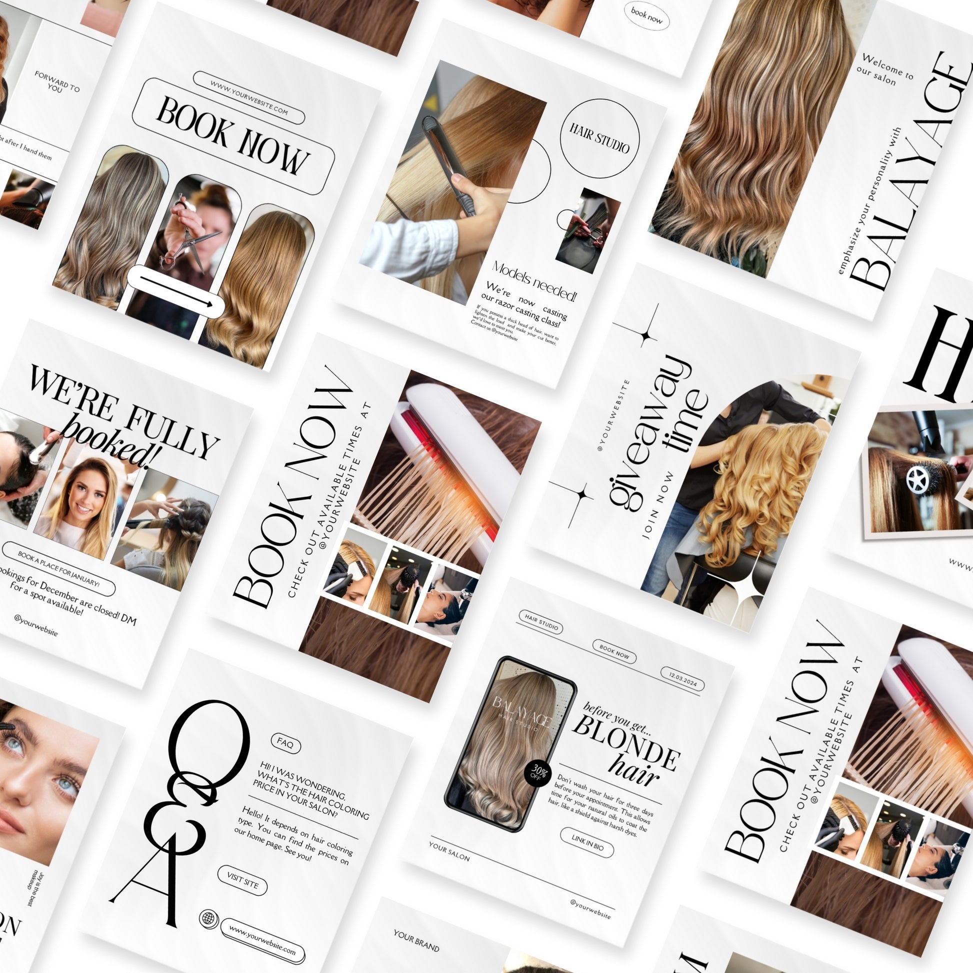 These are Hairstylist social media templates made in the Canva App. They will help you save hours of content creation and design, attract potential clients, and develop your business.
