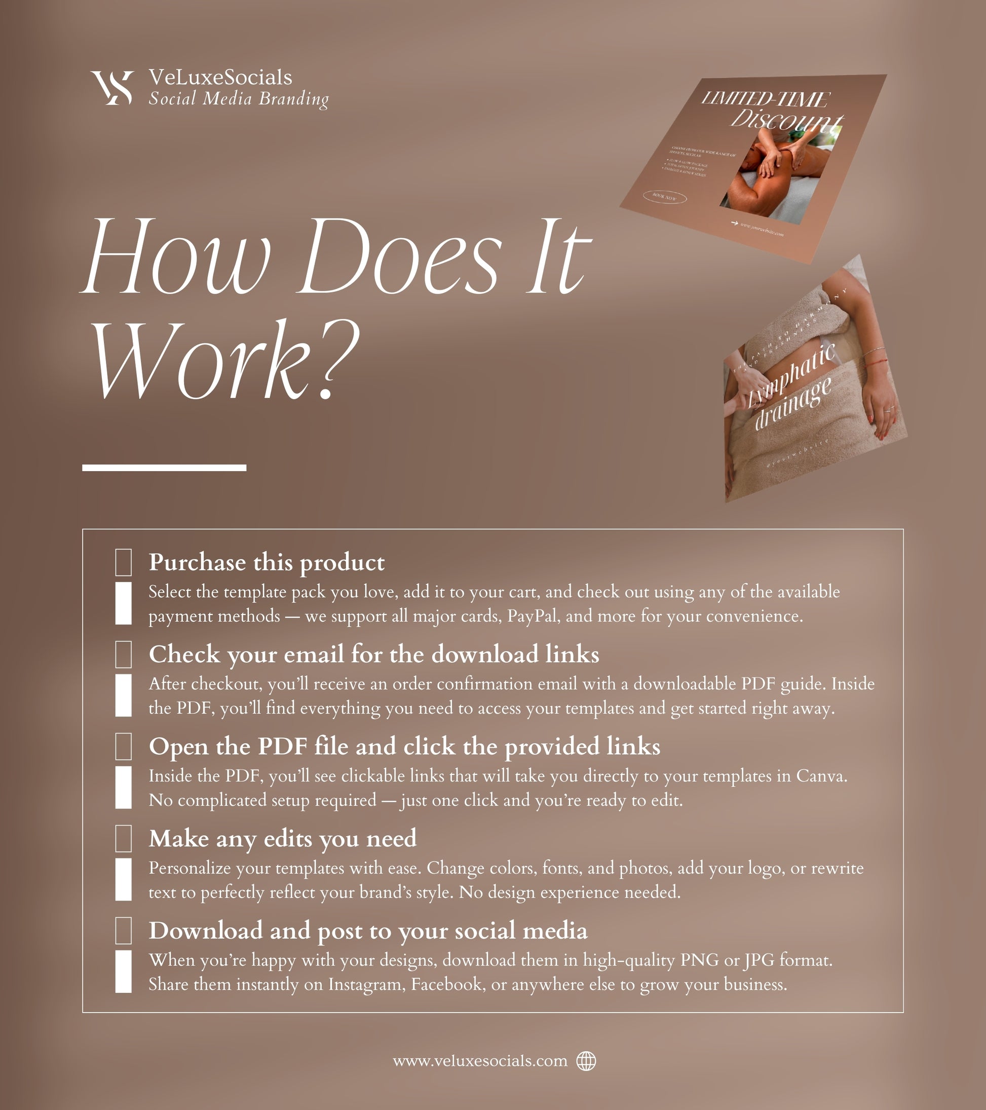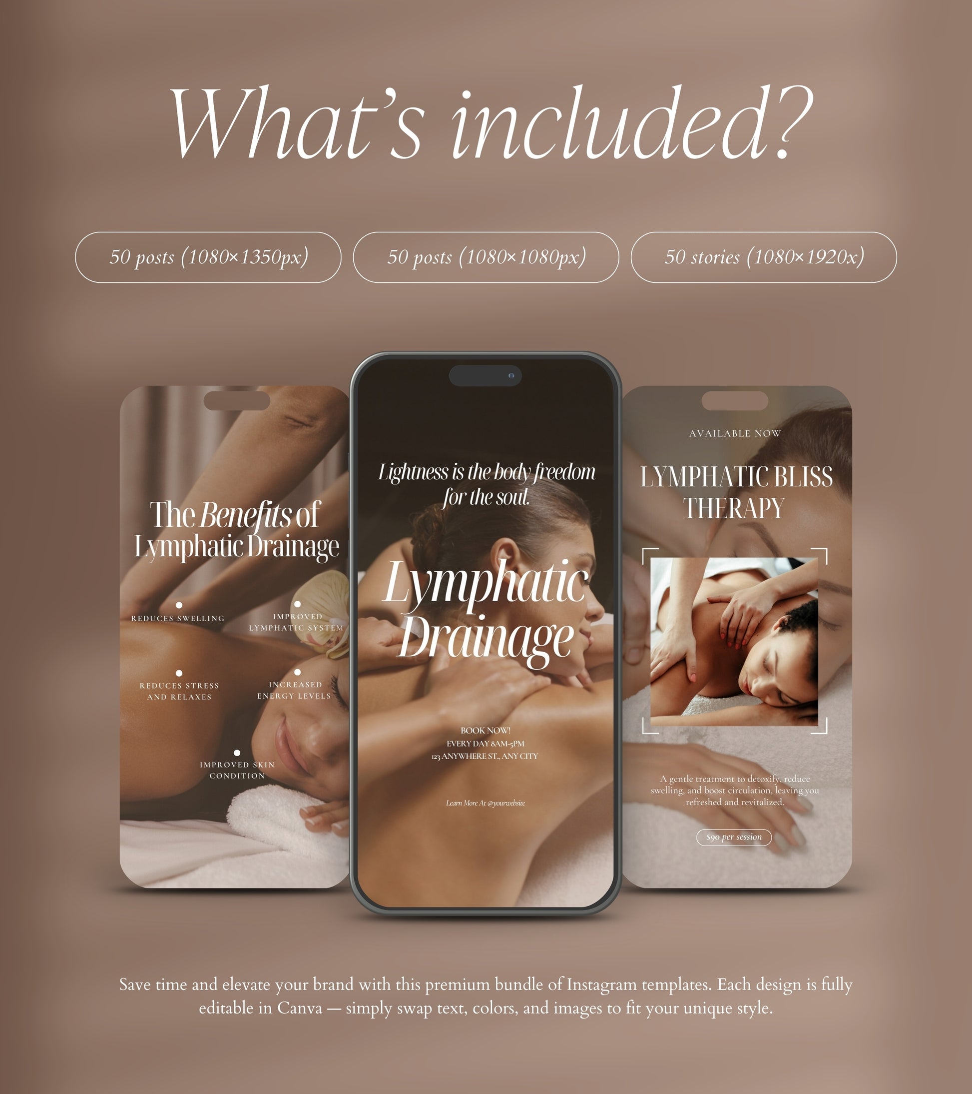 Introducing the Lymphatic Drainage Instagram Templates, expertly designed for use in the Canva App. These templates are intended to significantly reduce your content creation and design time, while enhancing client attraction and business development.