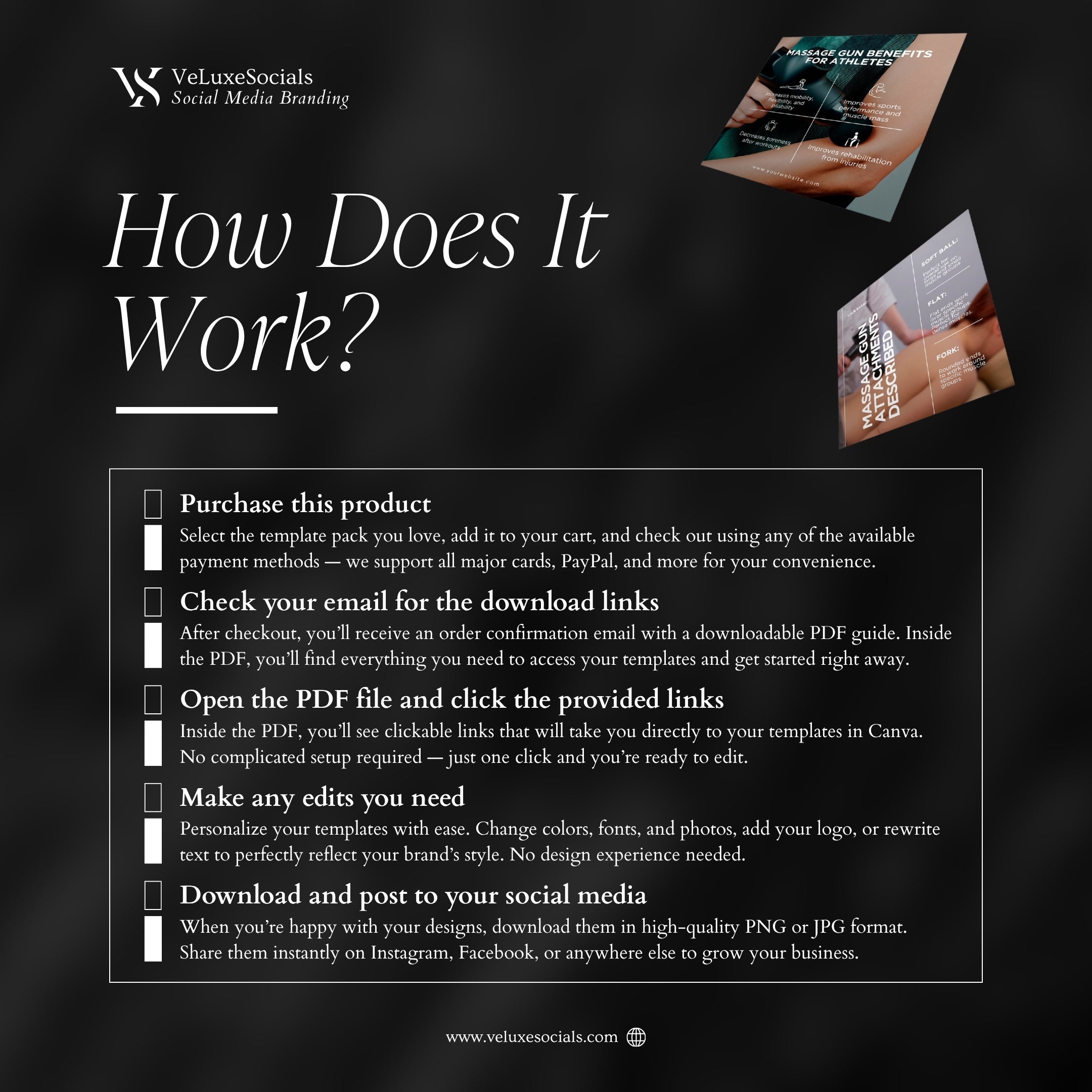 After purchase, you will receive instant access to a downloadable PDF containing the template links. Open the links in Canva, customize the designs by adjusting photos, fonts, colors, and text, then download and publish them on your social media.