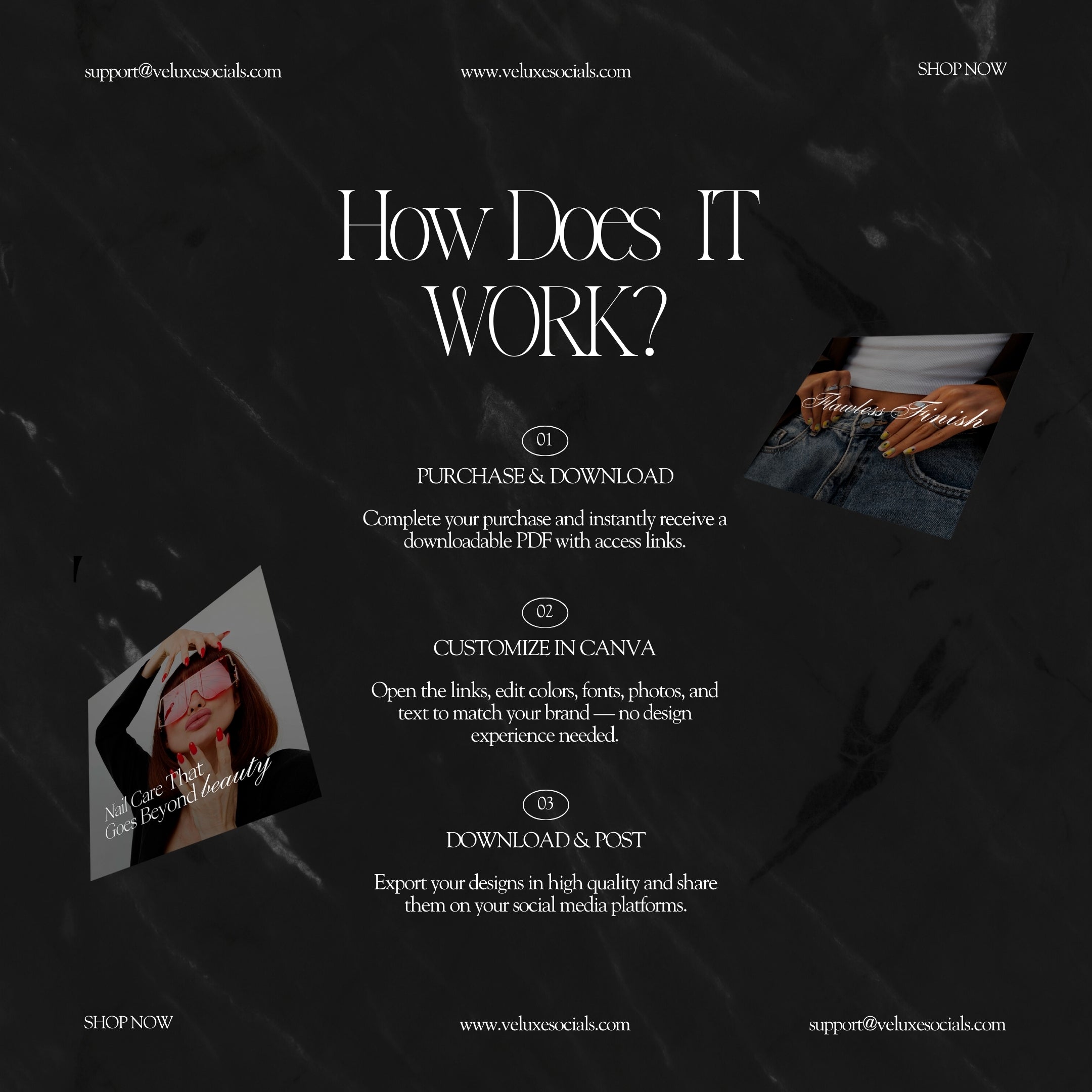 After purchase, you will receive instant access to a downloadable PDF containing the template links. Open the links in Canva, customize the designs by adjusting photos, fonts, colors, and text, then download and publish them on your social media.