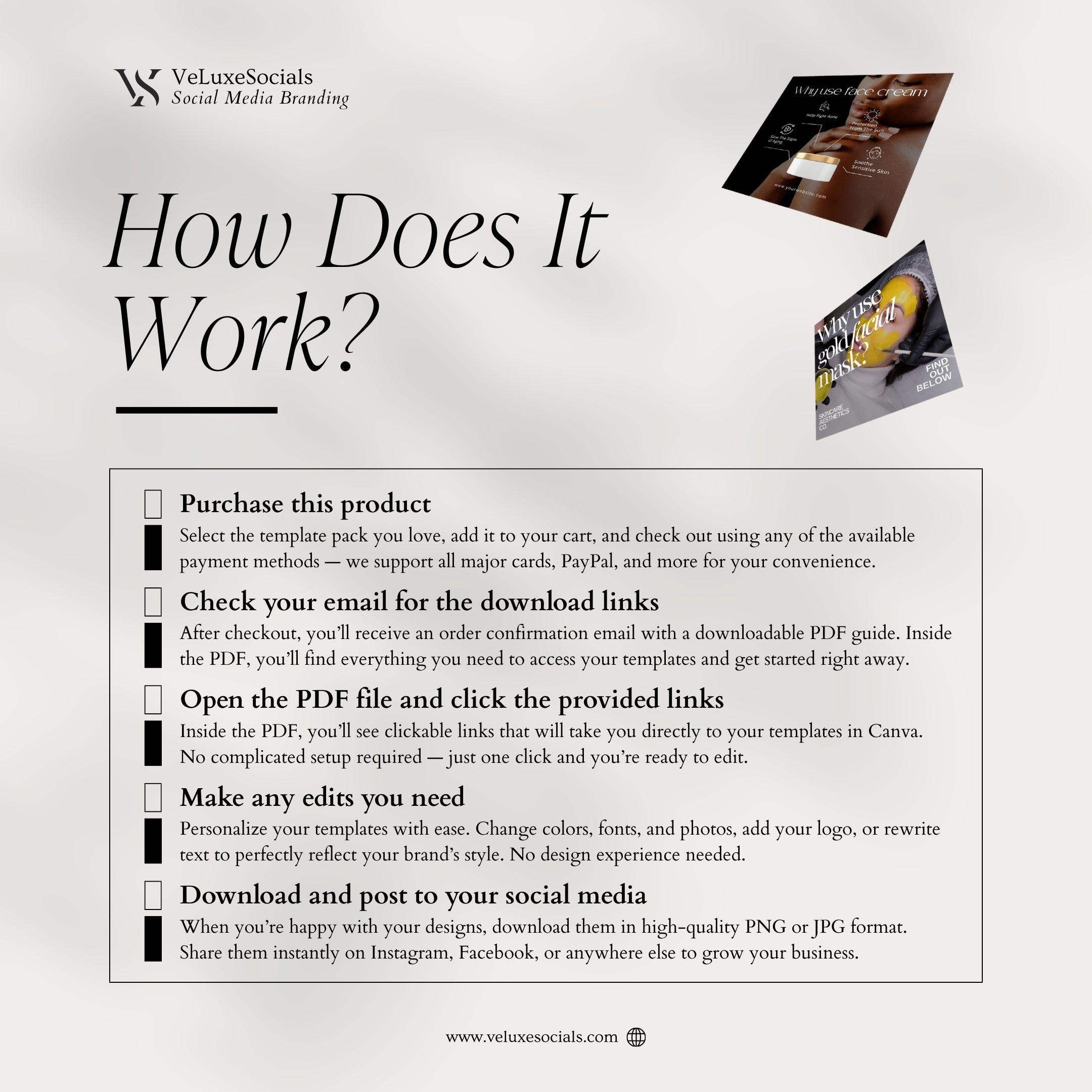 After purchase, you will receive instant access to a downloadable PDF containing the template links. Open the links in Canva, customize the designs by adjusting photos, fonts, colors, and text, then download and publish them on your social media.